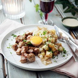 Put onion, potatoes and meat on a warm serving plate and top with egg yolks and parsley. Serve with the mustard creme.
